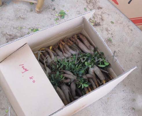 Ficus ginseng, v poslední době je velmi často nabízen ve velkém množství za poměrně nízkou cenu. Dováží se z nejteplejších oblastí Číny (teplota 30 – 40oC vlhkost nad 90 %). Podnože síly 10 cm jsou 1 rok staré, kořeny a koruna je odstraněna mačetou. Na pahýly větví jsou naočkovány pupeny fíkusu s masitými listy. Při vysoké teplotě a vlhkosti z oček na stromku bez kořenů za jeden měsíc narostou větve délky 15 cm a síly tužky. Potom jsou zasazeny do rašeliny a poslány do Evropy.