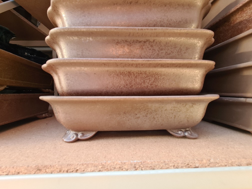 Bonsai miska 22 x 17 x 5,5 cm, barva hnědožlutá Bonsai miska 21 x 16,5 x 4,5 cm, barva hnědá Bonsai miska 22 x 17 x 5,5 cm, barva modrá Bonsai miska 18,5 x 14,5 x 4,5 cm, barva vínovobílá