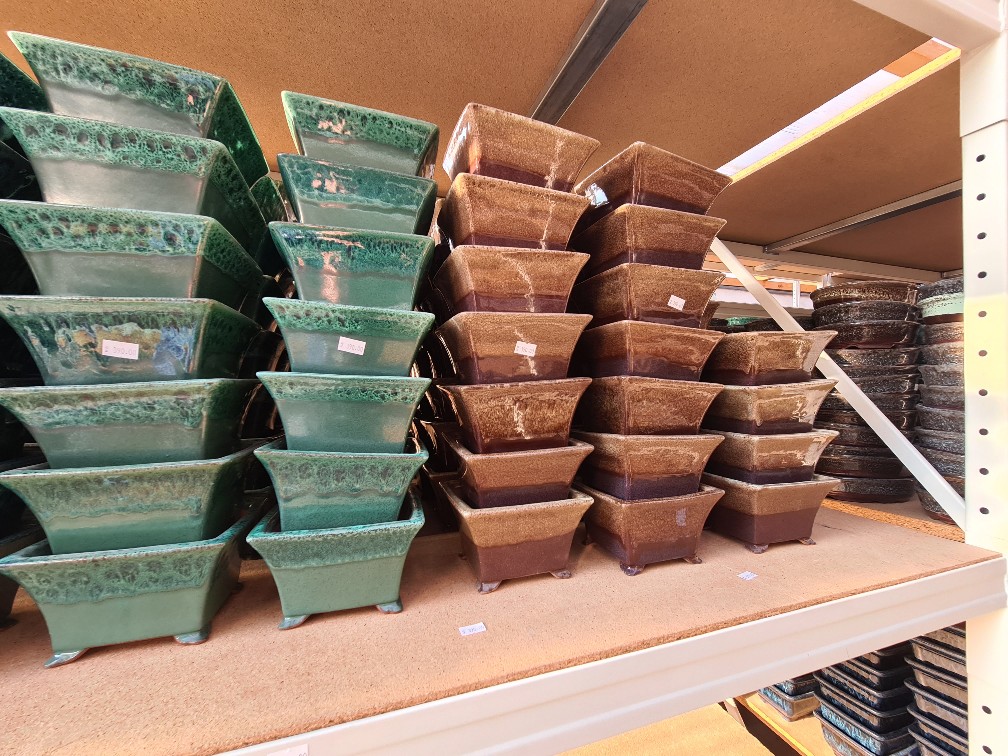 Bonsai miska 29 x 29 x 11 cm, barva zelená Bonsai miska 21 x 21 x 11 cm, barva zelená Bonsai miska 12 x 12 x 7 cm, barva hnědá Bonsai miska 21 x 14 x 5 cm, barva zelená